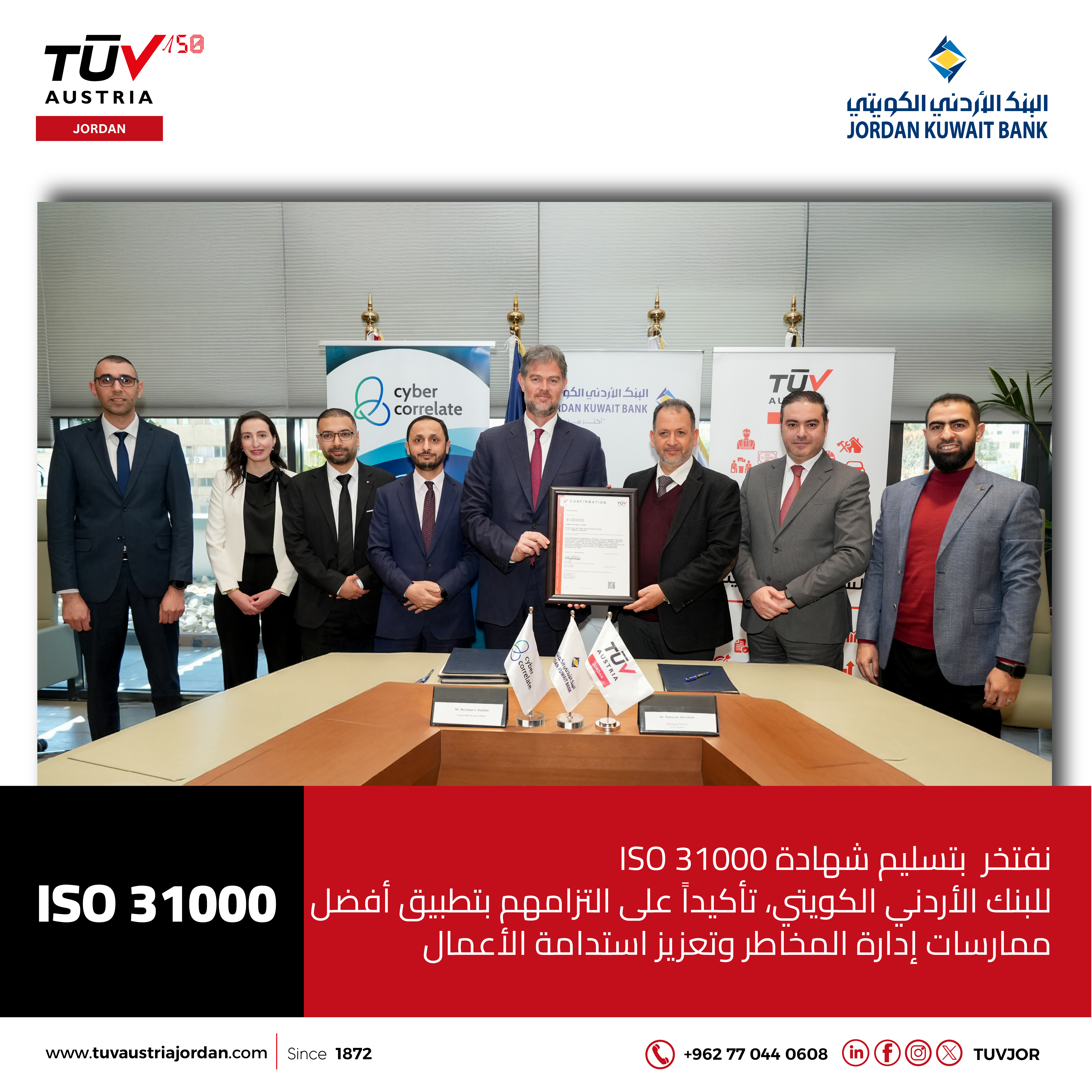 Jordan Kuwait Bank has announced that it has obtained, for the first time, certification of alignment with the international standard ISO 31000:2018 for Risk Management. This achievement reflects the Bank’s commitment to adopting global best practices, strengthening corporate governance frameworks, and enhancing risk management across its operations, while contributing to the robustness of the regulatory framework within the Jordanian banking sector. This milestone underscores the Bank’s strategic direction toward embedding risk management as a core component of its decision-making processes, thereby reinforcing institutional resilience and supporting sustainable performance amid the rapidly evolving banking landscape. The certification was granted by TÜV Austria, an internationally recognized certification body specializing in management systems assessment, based on a comprehensive and independent evaluation conducted by Cyber Correlate. The assessment covered the Bank’s risk management framework, associated policies and procedures, as well as implementation and control mechanisms, to verify alignment with the principles and requirements of ISO 31000. The Bank’s risk management framework encompasses all operations and activities, including credit, market, liquidity, operational, business, and reputational risks, in addition to cybersecurity risks, business continuity, and environmental, social, and governance (ESG)-related risks. This is implemented through an integrated methodology that ensures consistency and effectiveness in risk identification, analysis, evaluation, treatment, and continuous monitoring. On this occasion, Mr. Haitham Al-Bataineh, Chief Executive Officer of Jordan Kuwait Bank Group, stated: "Obtaining alignment certification with ISO 31000:2018 reflects the Bank’s strategic commitment to strengthening corporate governance and embedding risk management as a fundamental element of decision-making. The Bank continues to enhance its tools and methodologies to reinforce its institutional framework, safeguard the interests of shareholders and clients, and strengthen confidence among regulators and stakeholders." For his part, Eng. Saeed Al-Lubani, Chief Executive Officer of Cyber Correlate, expressed his pride in partnering with Jordan Kuwait Bank on this achievement, highlighting that it further reinforces the Bank’s leadership as a benchmark for sound governance and risk management practices within the banking sector. Meanwhile, Eng. Mahmoud Mustafa, General Manager of TÜV Austria, emphasized that awarding the ISO 31000:2018 alignment certification to Jordan Kuwait Bank reflects its commitment to implementing international best practices in risk management. He noted that the assessment results demonstrated a comprehensive and effective risk management framework that supports corporate governance and enhances the Bank’s ability to navigate challenges in a dynamic business environment. This certification is the result of a comprehensive institutional development program implemented by the Bank, which included a full reassessment of its risk management framework, updates to relevant methodologies and policies, and strengthened integration of risk management into strategic planning processes.